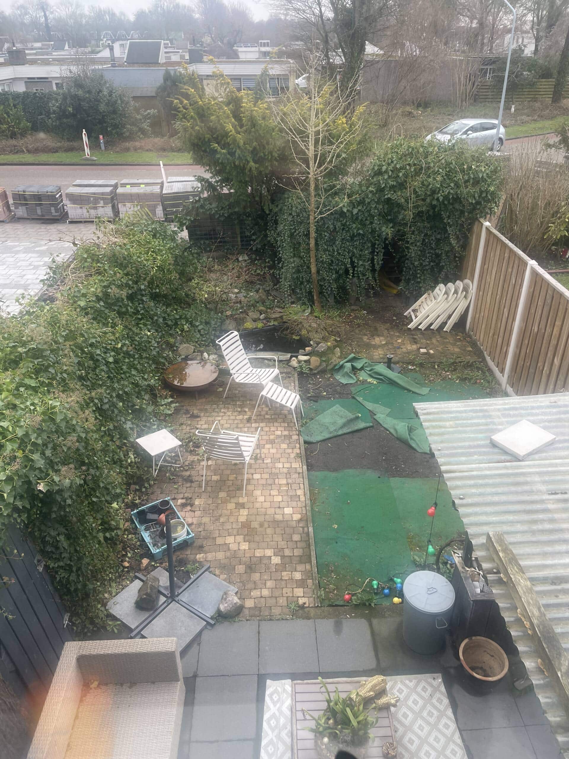 Dit project begon met een tuin die dringend behoefte had aan wat liefde. De schutting en het tuinhuis waren volledig overgroeid, de hedera had alles in zijn greep en het tuinhuis was nauwelijks nog zichtbaar. De vijver was verwaarloosd en de boompjes stonden er verloren bij. We hebben alles zorgvuldig verwijderd en afgevoerd zodat er weer ruimte is ontstaan voor een frisse start.